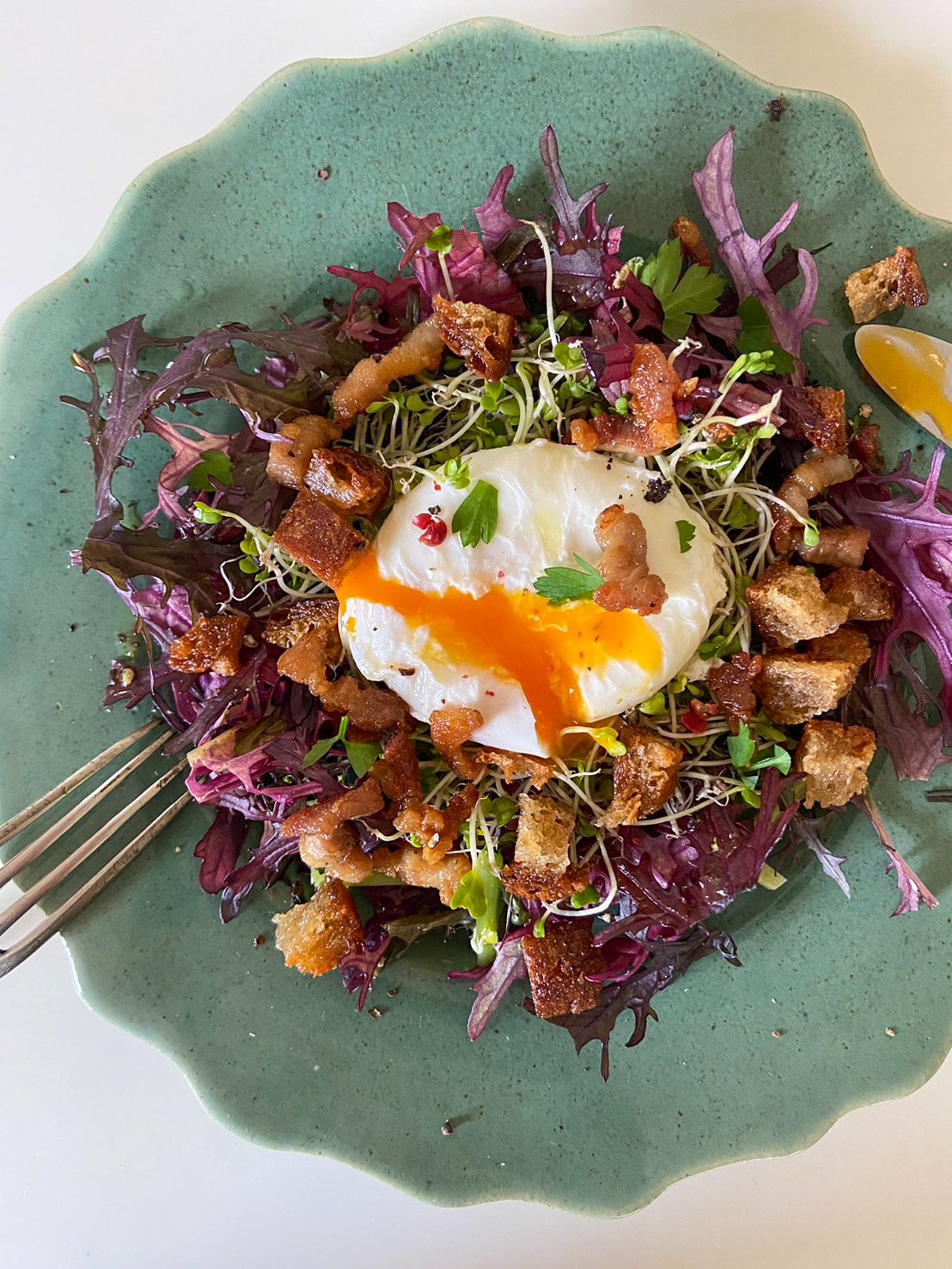 - 前菜…ポークサレ(自家製塩豚)と季節のリーフ、ウフポッシェのサラダ