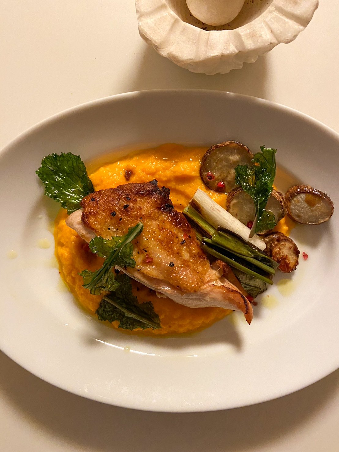 - メイン…ローストチキン、無農薬キャロットソースと季節の野菜添え